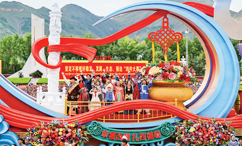 2025年8月21日上午,西藏各族各界干部群眾約2萬人歡聚拉薩市布達(dá)拉宮廣場(chǎng),熱烈慶祝西藏自治區(qū)成立60周年。圖為游行的彩車通過布達(dá)拉宮廣場(chǎng)。 新華社記者 謝環(huán)馳/攝
