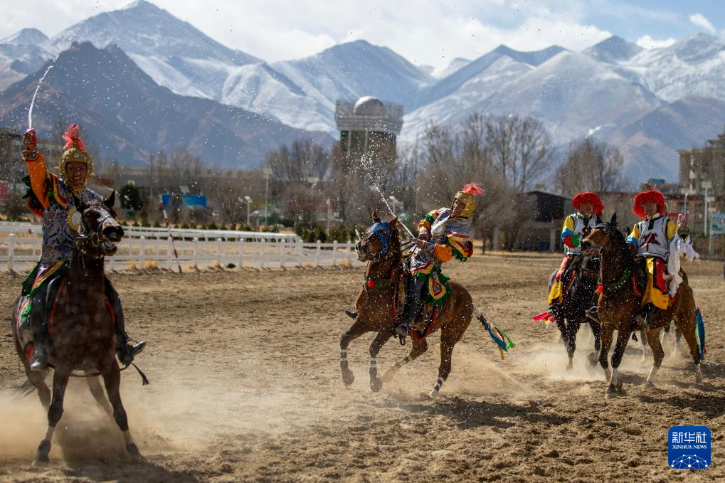 3月2日,2025年藏歷新年初三民族傳統(tǒng)馬術(shù)表演暨民族賽馬活動(dòng)在拉薩市北郊賽馬場(chǎng)舉行。圖為馬術(shù)隊(duì)員在表演后慶祝。新華社記者 姜帆 攝