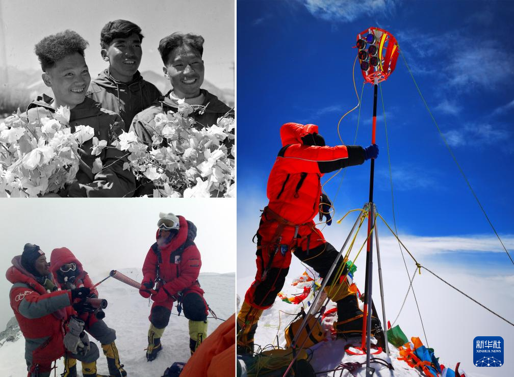 拼版照片:左上圖為1960年5月登上珠穆朗瑪峰頂?shù)闹袊?guó)登山隊(duì)隊(duì)員王富洲(右)、貢布(中)和屈銀華(資料照片 新華社發(fā));左下圖為2008年5月8日,北京奧運(yùn)圣火珠峰傳遞登山隊(duì)隊(duì)員羅布占堆(左)點(diǎn)燃第一棒火炬手吉吉手中的“祥云”火炬(新華社發(fā));右圖為2020珠峰高程測(cè)量登山隊(duì)隊(duì)員在珠穆朗瑪峰峰頂開(kāi)展測(cè)量工作(2020年5月27日新華社特約記者扎西次仁攝)。新華社發(fā)