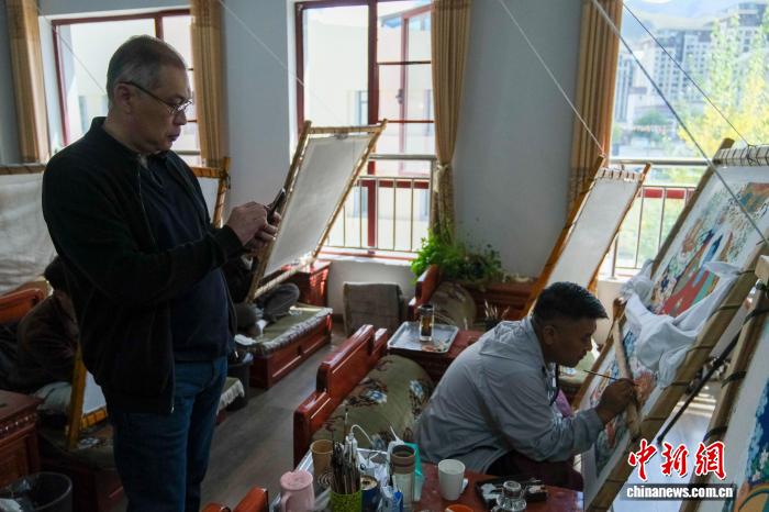 9月26日,哈薩克斯坦駐華大使努雷舍夫在西藏唐卡畫院觀看了解唐卡繪制過(guò)程。中新社記者 江飛波 攝