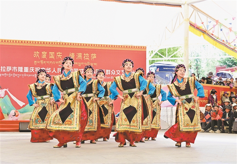 10月1日,宗角祿康公園內(nèi)歌舞飛揚(yáng)、歡聲雷動(dòng),“歡度國慶·情滿拉薩”拉薩市隆重慶祝中華人民共和國成立76周年群眾文藝演出在這里舉行。演出現(xiàn)場(chǎng)氣氛熱烈,富有民族特色的藏戲、傳統(tǒng)歌舞接連上演,歌聲、掌聲、歡呼聲此起彼伏,生動(dòng)表達(dá)了拉薩各族人民對(duì)偉大祖國的美好祝愿。圖為女子舞蹈《春韻》。記者 王敏 攝