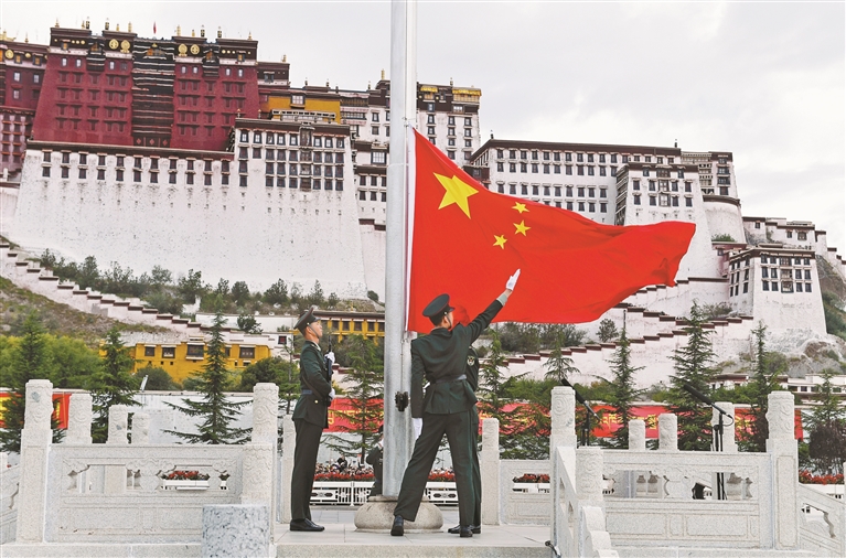 國(guó)旗飄揚(yáng),激發(fā)愛(ài)國(guó)力量;國(guó)歌雄壯,奏響奮進(jìn)樂(lè)章。大家一致表示,要更加緊密地團(tuán)結(jié)在以習(xí)近平同志為核心的黨中央周圍,全面貫徹習(xí)近平總書記關(guān)于西藏工作的重要指示和新時(shí)代黨的治藏方略,深入貫徹落實(shí)習(xí)近平總書記視察西藏時(shí)的重要講話精神,聚焦“四件大事”聚力“四個(gè)創(chuàng)建”,銳意進(jìn)取、埋頭苦干,把滿腔的愛(ài)國(guó)熱情轉(zhuǎn)化為干事創(chuàng)業(yè)的不竭動(dòng)力,以更加務(wù)實(shí)的作風(fēng)、更加昂揚(yáng)的斗志積極投身工作,為共建中華民族共同體、書寫美麗西藏新篇章貢獻(xiàn)力量。