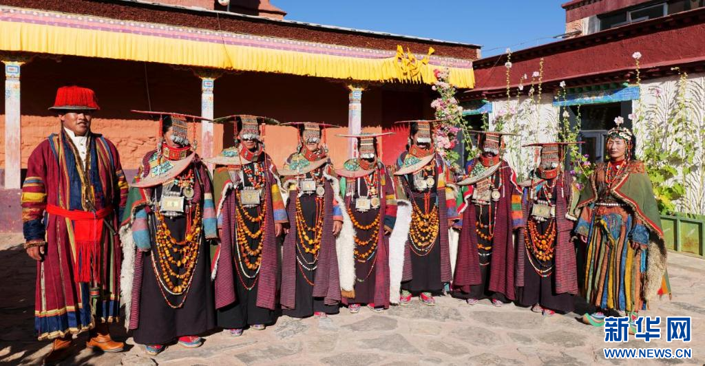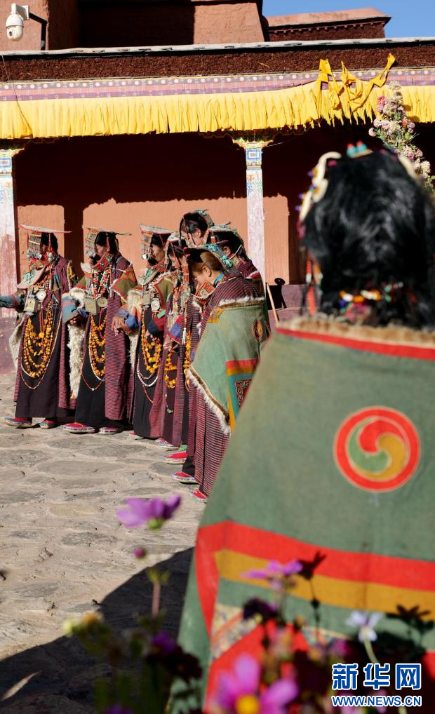 圖為身穿普蘭服飾的科迦村村民在表演宣舞(9月23日攝)。新華網(wǎng) 柑丹鴦琦 攝