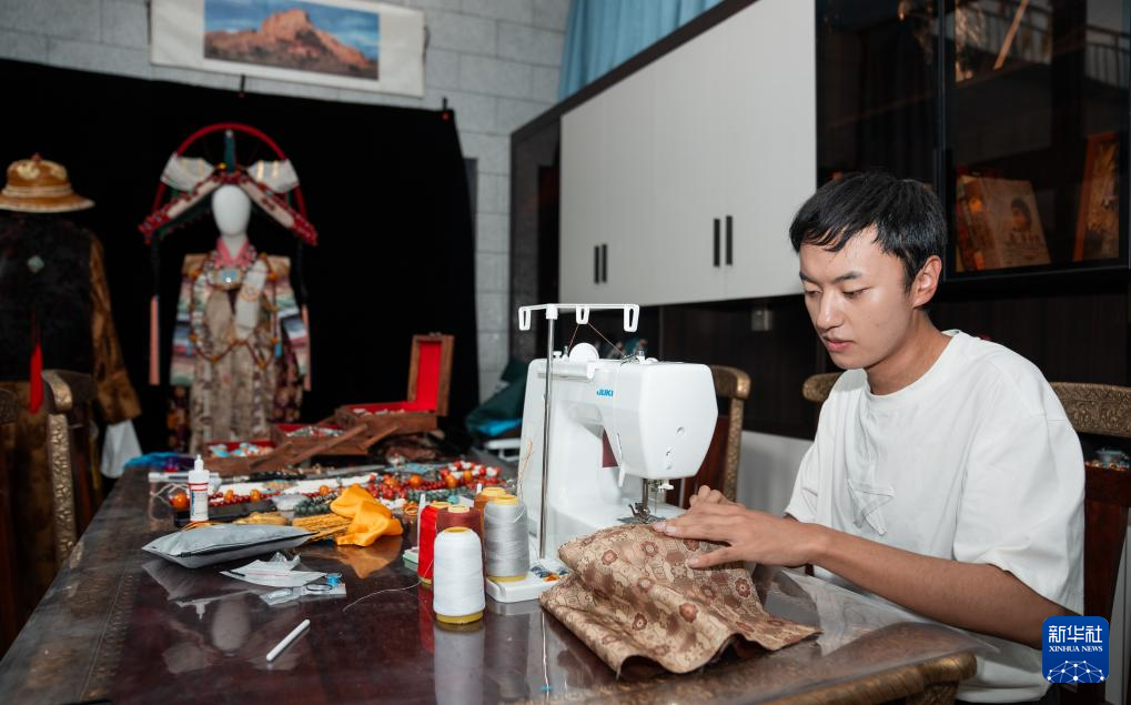 班珠丹塔在家中工作室內(nèi)縫制藏裝(9月11日攝)。新華社記者 丁增尼達(dá) 攝?