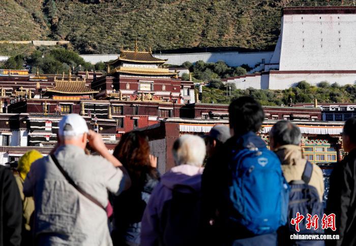 10月7日,游客在西藏日喀則市扎什倫布寺參觀。扎什倫布寺始建于公元1447年,是中國(guó)國(guó)家5A級(jí)旅游景區(qū)。憑借深厚的歷史底蘊(yùn)和獨(dú)特的文化魅力,吸引眾多中外游客參觀游覽。中新社記者 李林 攝