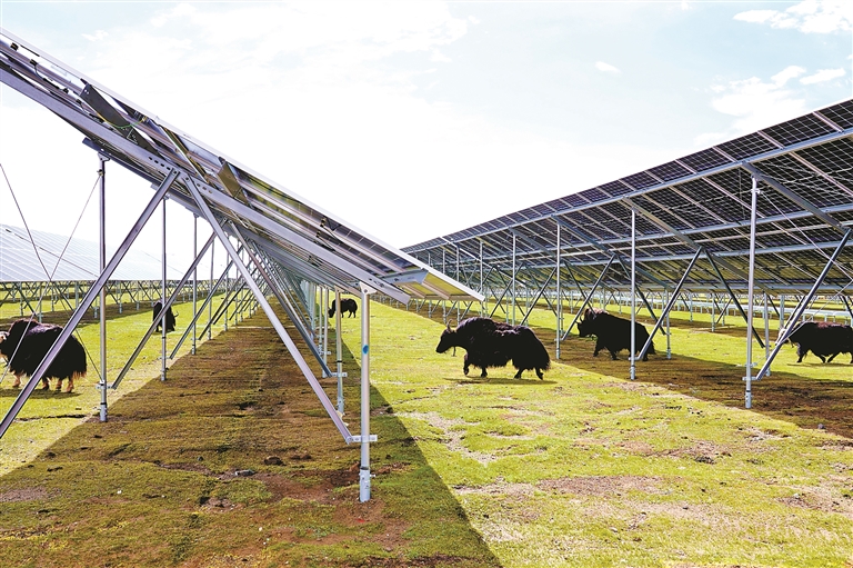 在華電羅布沙光伏項目區(qū),整齊的光伏板陣列與圣潔的雪山共同構(gòu)成獨特景致。光伏板下,回鋪的草甸悄然復(fù)蘇,牦牛悠然其間覓食,形成獨特的“牧光互補”模式,實現(xiàn)了生態(tài)保護(hù)與清潔能源生產(chǎn)的雙贏。