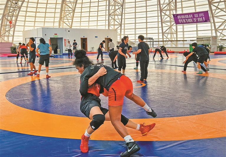 在摔跤場館,運動員進行摔跤訓練。記者 洛桑 攝