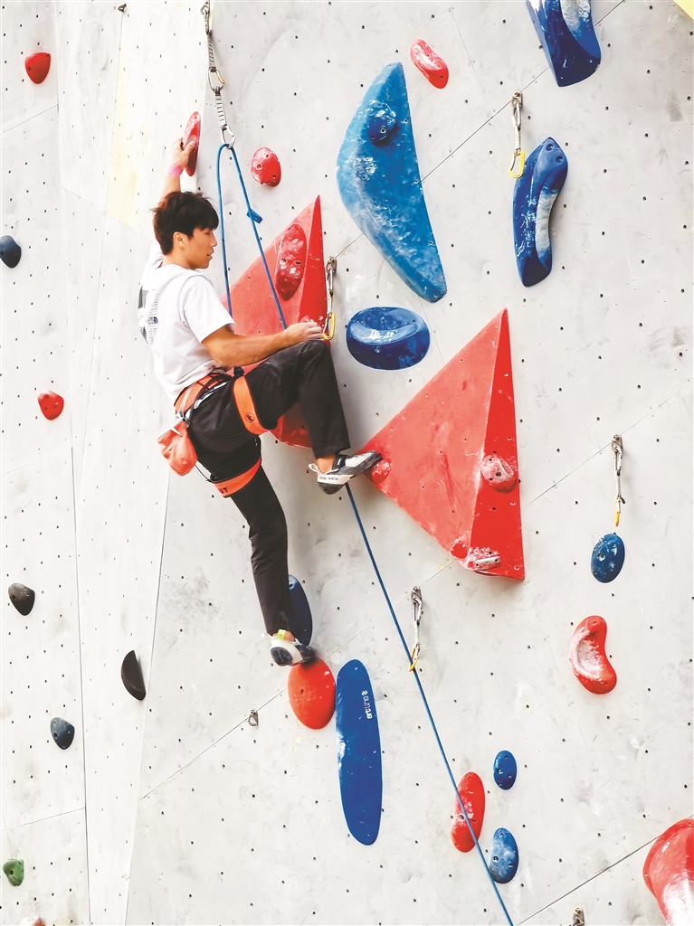 在攀巖場館,攀巖運動員正在訓練中。記者 洛桑 攝