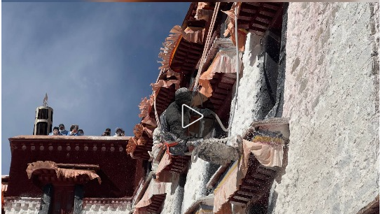 布達拉宮迎來了一年一度的“煥新”計劃,來自布達拉宮管理處的專業(yè)人員,與當(dāng)?shù)孛癖?、熱心志愿者們共同投入到這場“年度美容”工程中,為這座擁有千年歷史的古老宮殿披上潔白莊嚴(yán)的“新衣”。參與涂墻的民眾,身上、頭發(fā)上都沾滿了白色的涂料,仿佛落了一層細雪。同時,一桶桶涂料被有序地傳送并潑灑在墻面上,布達拉宮這座屹立千年的宮殿在陽光下也愈發(fā)明亮。除此之外,大昭寺、色拉寺等大大小小的寺廟及民居的房屋也會開始粉刷,這一工作將在藏歷九月二十二日之前完成。