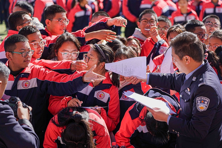 西藏“開(kāi)學(xué)第一課”網(wǎng)絡(luò)普法進(jìn)校園活動(dòng)中,民警為學(xué)生發(fā)放普法宣傳知識(shí)手冊(cè)。記者 貢曲羅杰 攝