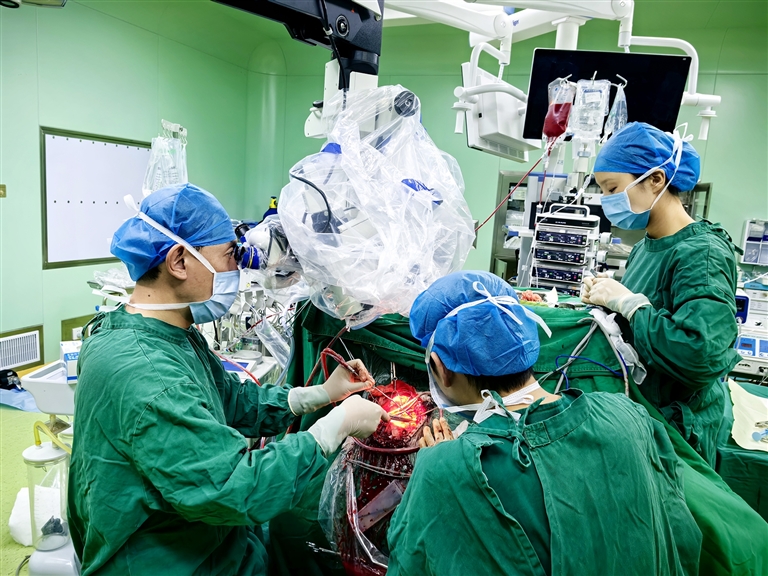 手術當日,在麻醉科和手術室護士團隊的密切配合下,由郝強主刀,單永炳、付永鵬擔任助手,為患者實施了手術。術中,郝強在顯微鏡下仔細分離腫瘤周邊的重要血管,最大程度保護周邊腦組織不受損傷,如同在生命禁區(qū)里仔細操作。術中一次性完整切除位于不同腦葉的3枚腫瘤,由于腦膜上散在多枚微小腦膜瘤,遂將侵犯腦膜一同切除。手術過程順利,患者恢復良好。術后復查頭顱MRI顯示,顱內腫瘤已完全消失,無殘留。目前患者積極康復治療,將擇期出院。