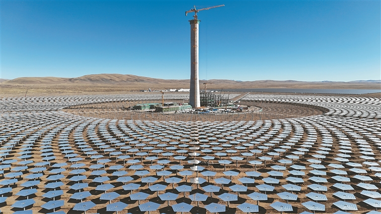 記者在施工現(xiàn)場了解到,該吸熱塔配置近1.6萬臺定日鏡,總采光面積超80萬平方米,工人正在緊張有序安裝,計劃于明年3月搭建完畢,塔頂吸熱器擬于明年4月安裝完成。屆時一座座五邊形的定日鏡,就像草原上的一朵朵“向日葵”,實時追蹤太陽位置,將陽光反射至中央吸熱塔,呈現(xiàn)“萬鏡朝陽、塔耀雪山”的壯麗景象,如同科幻電影里的場景,成為藏北高原上一座“亮眼”的綠色能源地標(biāo)。