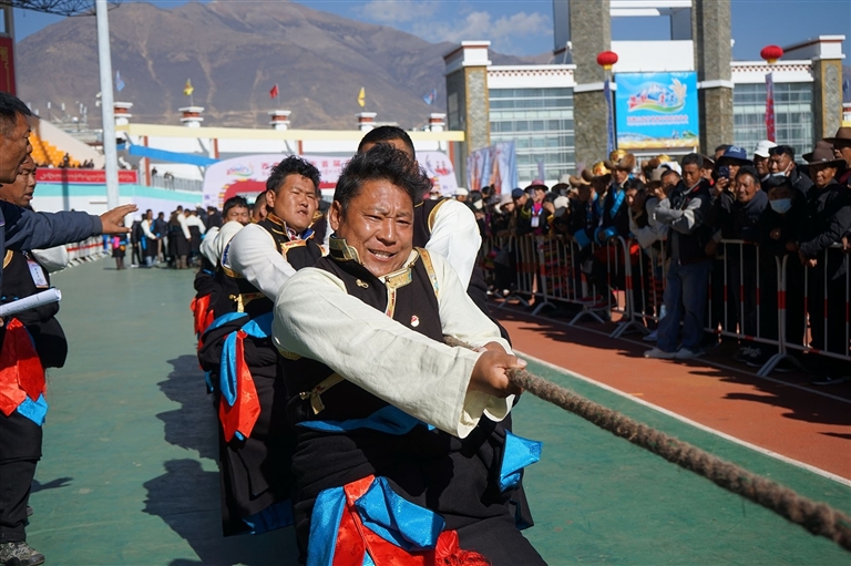 記者置身于賽場,最直觀的感受并非競技的緊張,而是一種蓬勃的生命力在盡情舒展。這里的比賽,吶喊聲帶著鄉(xiāng)音,勝利的歡呼與田間勞作時的號子相互呼應(yīng)。在極具特色的“押加”比賽(即大象拔河)現(xiàn)場,來自隆子縣的扎西達(dá)杰成為全場的焦點。他穿著隆子縣的傳統(tǒng)服飾,面容質(zhì)樸神情嚴(yán)肅,裁判哨聲吹響,與對手反向?qū)乃查g,他全身的肌肉瞬間繃緊,四肢緊緊地“吸附”在地上,那是在千百次揮鎬、背負(fù)牧草中錘煉出的力量。僵持、角力,在鄉(xiāng)親的“加油”聲中,他猛然發(fā)力,贏得了比賽。