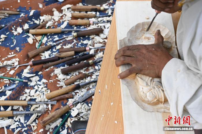 11月23日,第二屆“工巧杯”西藏工藝美術(shù)中青年高技能人才技藝大賽現(xiàn)場(chǎng)實(shí)操技能在拉薩市唐卡藝術(shù)博物館開(kāi)賽。本次大賽以“薪火相傳 守正創(chuàng)新”為主題,由284名選手來(lái)自西藏6(市)地的42個(gè)縣(區(qū)),涵蓋唐卡、雕塑、編織等36類工藝。據(jù)悉,西藏工藝美術(shù)行業(yè)現(xiàn)有2700余家市場(chǎng)主體、3.7萬(wàn)余名從業(yè)者,2024年產(chǎn)值超30億元(人民幣)。圖為參賽選手展示木雕作品。中新社記者 貢嘎來(lái)松 攝