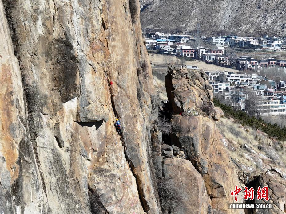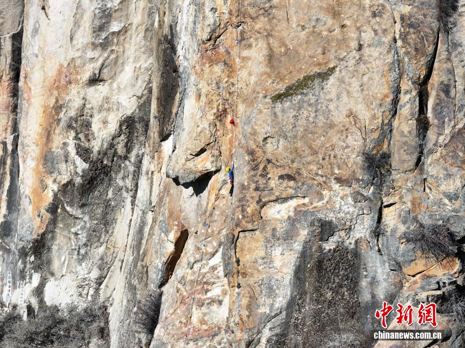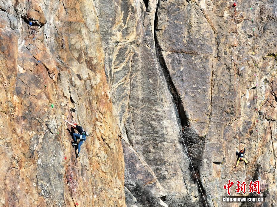 11月29日,2025西藏自治區(qū)攀巖自然巖壁公開賽在拉薩市奪底溝吉倉自然巖壁場地開賽。來自中國全國的70名運動員、高校學生及社會攀巖愛好者參賽。(無人機照片)中新社記者 貢嘎來松 攝