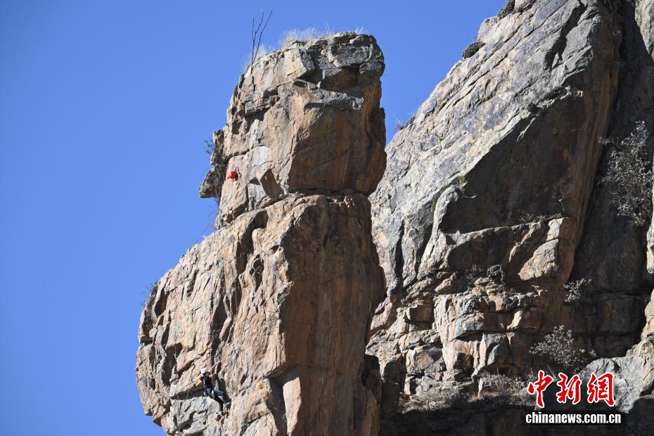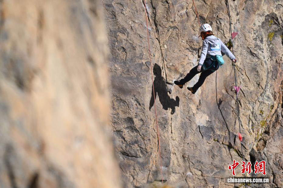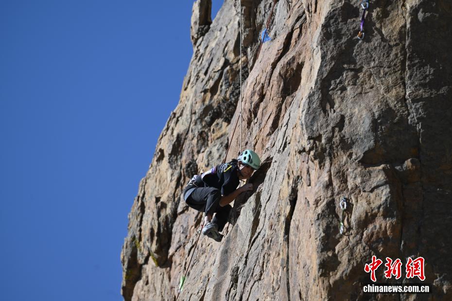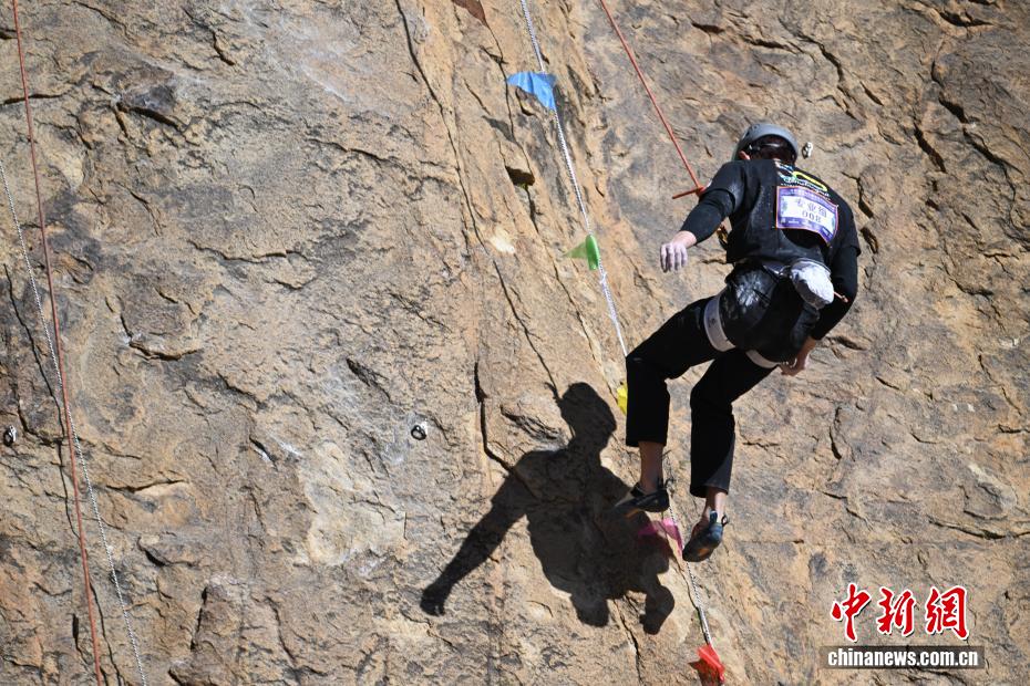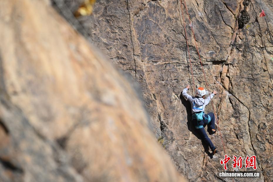 11月29日,2025西藏自治區(qū)攀巖自然巖壁公開賽在拉薩市奪底溝吉倉自然巖壁場地開賽。來自中國全國的70名運動員、高校學生及社會攀巖愛好者參賽。中新社記者 貢嘎來松 攝