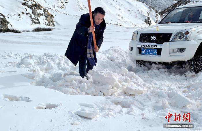 圖為在下鄉(xiāng)途中,扎西平措鏟雪開路。巴青縣雅安鎮(zhèn)格夏貢村駐村 供圖