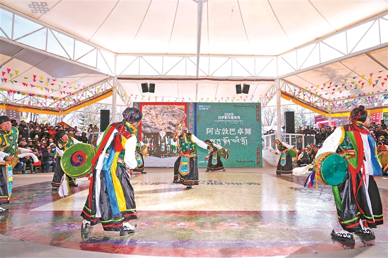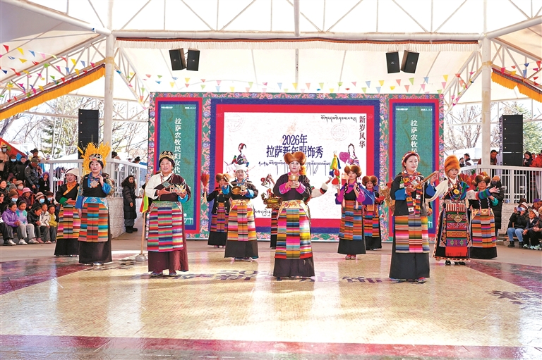 圖為2026拉薩新年服飾秀拉薩農(nóng)牧民婦女代表“村T秀”宗角祿康公園活動(dòng)現(xiàn)場。
