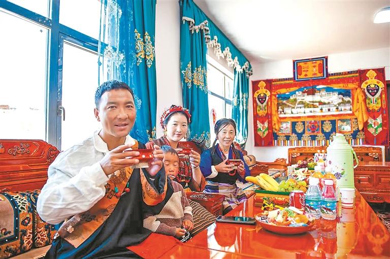 定結(jié)縣乃村村民在喝新房里的第一杯酥油茶。西藏日?qǐng)?bào)記者 旦增嘎瓦 攝