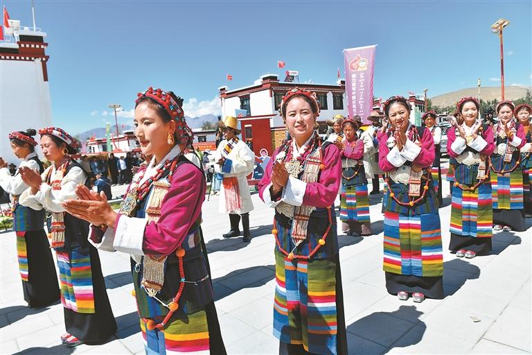 定日縣森嘎村身著盛裝的群眾慶祝喜遷新居。西藏日?qǐng)?bào)記者 王敏 攝
