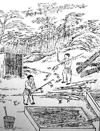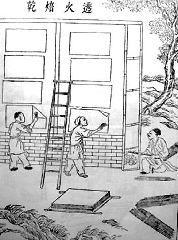 18世紀(jì)末,清乾隆年間由中國畫師手繪的竹紙制造全套工藝流程工筆設(shè)色組畫,由在京的法國耶穌會士蔣友仁寄往巴黎。竹紙制造系列圖共24幅,具有宮廷畫師畫風(fēng),因其兼具藝術(shù)和技術(shù)的雙重價值,在歐洲不斷被人臨摹。現(xiàn)知多套彩色摹本分別藏于巴黎國家圖書館、法蘭西研究院圖書館及德國萊比錫書籍博物館等地。1815年巴黎出版的《中國藝術(shù)、技術(shù)與文化圖說》中公布了其中的13幅,這些圖為后世有關(guān)造紙技術(shù)的專著爭相引用。此組畫重點向歐洲人展示了抄紙竹簾的型制及用法、濕紙人工干燥技術(shù)和植物黏液的使用等。明代宋應(yīng)星的《天工開物》于18世紀(jì)傳到巴黎,1840年法蘭西學(xué)院漢學(xué)教授儒蓮將其中“殺青”(造紙)一章譯成法文,刊于《法蘭西科學(xué)院院刊》上,后又在另一刊物上發(fā)表了有關(guān)“竹紙制造”的論文。