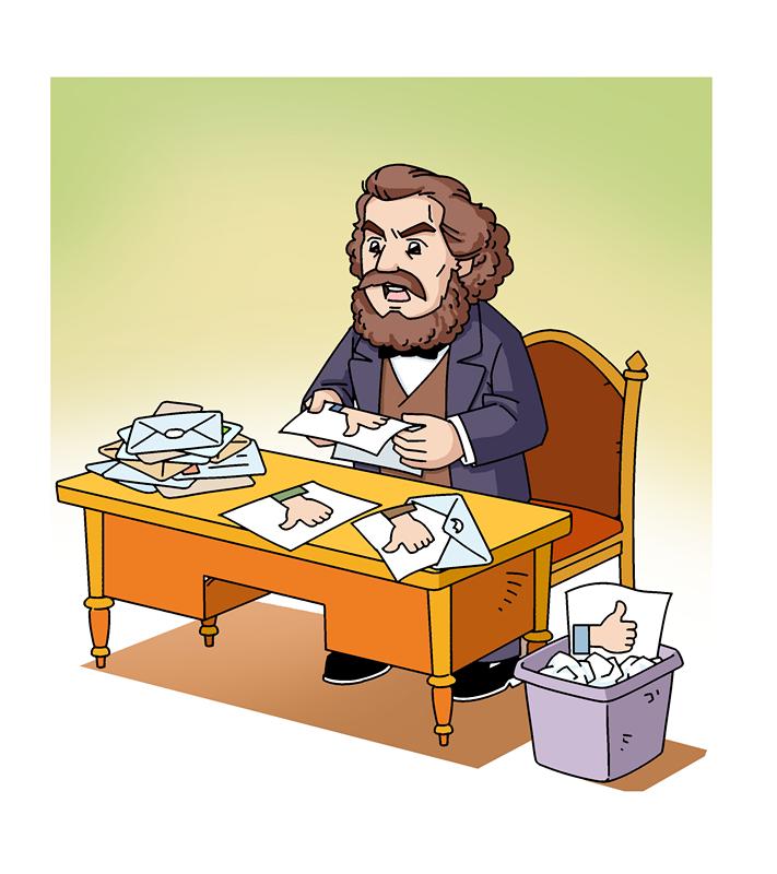 馬克思在一封信里說(shuō):“由于厭惡一切個(gè)人崇拜,在國(guó)際存在時(shí)期,我從來(lái)不公布那許許多多來(lái)自各國(guó)的、使我厭煩的歌功頌德的東西;我甚至從來(lái)不予答復(fù),偶爾答復(fù),也只是加以斥責(zé)。” 蘇凝/畫(huà)