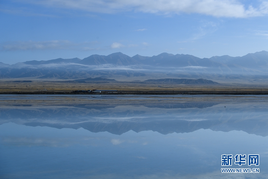茶卡鹽湖的清晨,平波微漾,山水共長天一色,神秘清幽,令人陶醉。新華網(wǎng) 潘彬彬攝