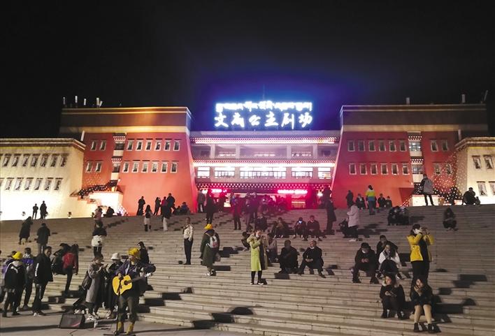 如今,拉薩除了布達(dá)拉宮、大昭寺……文成公主劇場(chǎng)及所在地慈覺林已然成為拉薩必游的又一新的打卡點(diǎn)。傍晚的慈覺林也因?yàn)槲某晒鞫鵁狒[非凡,雖然國(guó)慶黃金周已過,但是文成公主劇場(chǎng)前仍人潮涌動(dòng),游客、市民在這里欣賞美景、駐足,流浪歌手在這里熱情獻(xiàn)唱,小販的吆喝聲不斷,路邊的店鋪燈火通明,好不熱鬧。(記者 黃志武 見習(xí)記者 格桑央珍 桑吉 楊曦婷 攝)