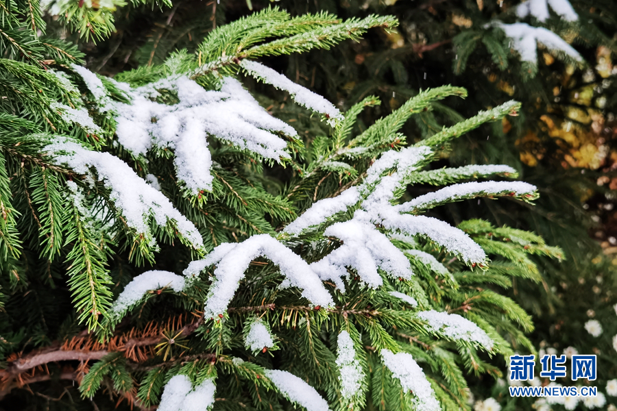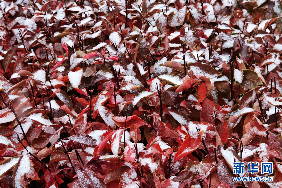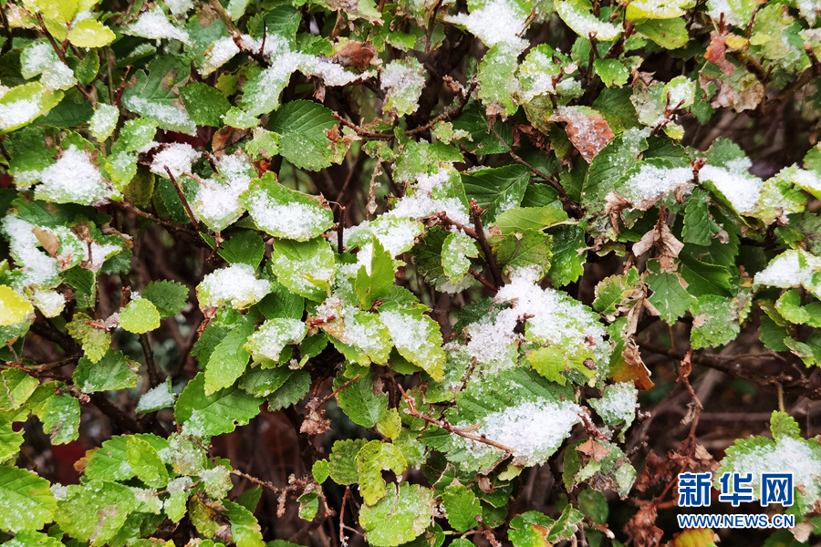 晶瑩的雪花落在樹葉上。新華網(wǎng)發(fā)(張海東攝)