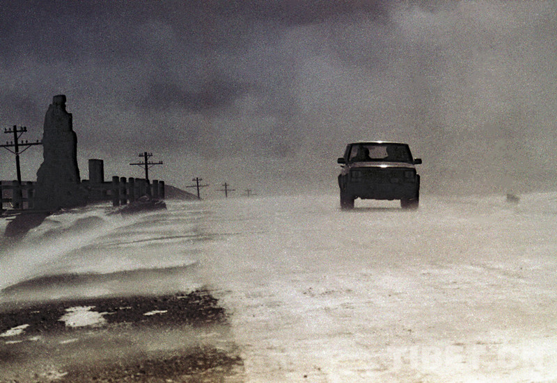 這是一輛汽車正在通過風雪彌漫的青藏公路最高處唐古拉山口(唐召明1991年冬攝)