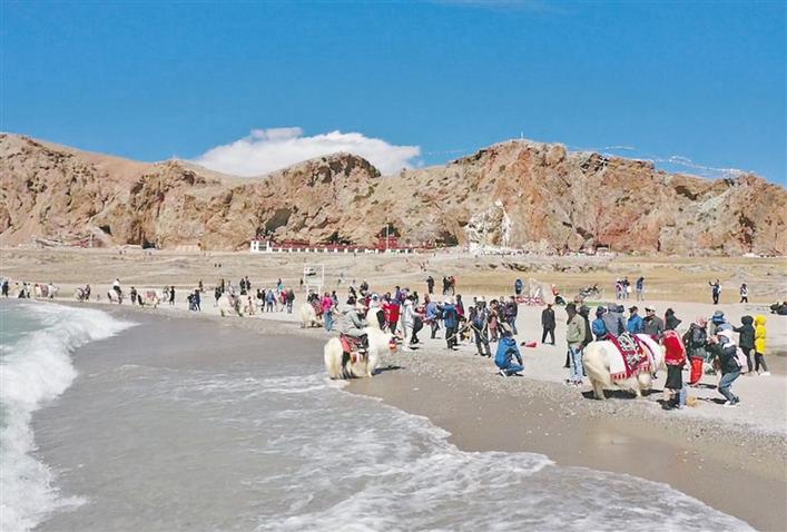 圖為游客在納木錯游玩。記者 洛桑 攝