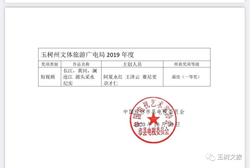 在當(dāng)天舉行的第八屆全國市縣電視臺、融媒體中心推優(yōu)展播活動表彰晚會上,全國100多家市縣電視臺、融媒體中心的代表和來自全國各地的領(lǐng)導(dǎo)、嘉賓齊聚。活動現(xiàn)場頒發(fā)了最佳短視頻單位、最佳電視專題單位、最佳電視欄目單位、最佳綜藝晚會單位、媒體融合先導(dǎo)單位等獎項。玉樹藏族自治州文體旅游廣電局獲最佳短視頻單位,其2019年度短視頻作品《長江、黃河、瀾滄江源采水紀(jì)實宣傳片》獲得“最佳短視頻一等獎”榮譽。