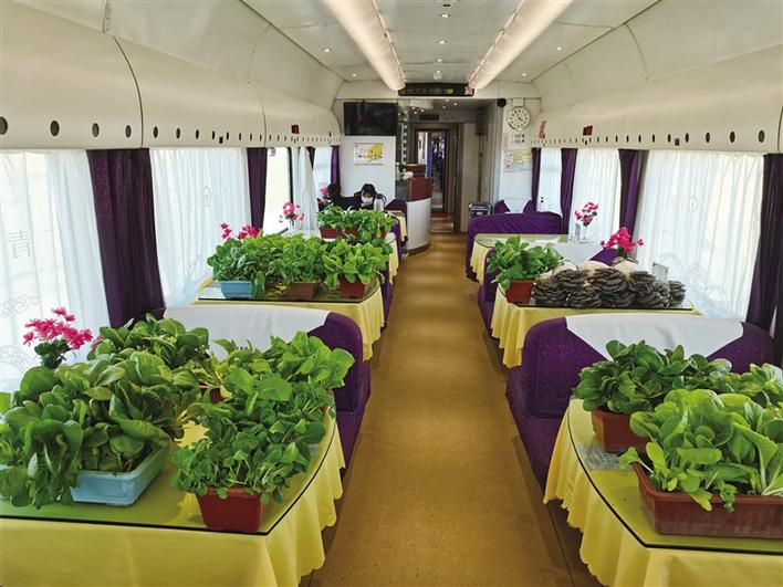 車窗外草原蒼茫,雪山巍峨,車廂里綠意盎然,一盆盆新鮮蔬菜隨著列車,一路西行,自由生長,旅客們吃著原汁原味的“泥土菜”,一路歡歌,一路美景到拉薩。(圖由青藏鐵路集團(tuán)有限公司提供)