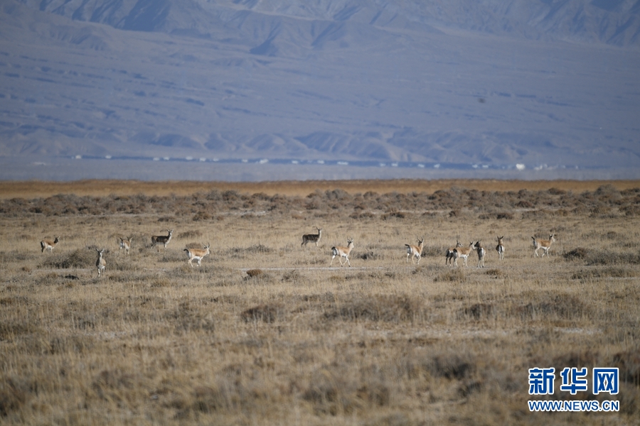 一群鵝喉羚在都蘭湖國(guó)家濕地公園內(nèi)活動(dòng)。(11月21日攝)新華網(wǎng) 潘彬彬攝