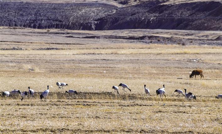 遠(yuǎn)遠(yuǎn)望去,只見高頸長腿的黑頸鶴一邊覓食、一邊梳理羽毛,悠然自得。如果耐心一點(diǎn)在田間蹲守,不時(shí)還可以看到成群的黑頸鶴飛翔于冬日的藍(lán)天下,姿態(tài)優(yōu)美地盤旋,尋找合適的田間落下。旦增說,它們要覓食至傍晚時(shí)分,才成群結(jié)隊(duì)飛回虎頭山水庫。