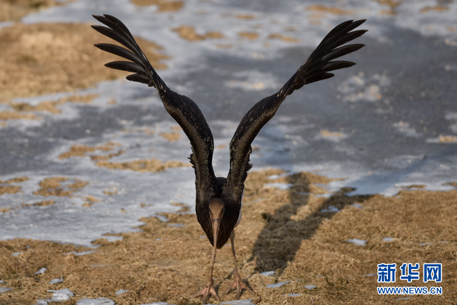 12月6日,一只黑鸛在西寧市北川河濕地公園內(nèi)嬉戲。新華社記者 吳剛 攝
