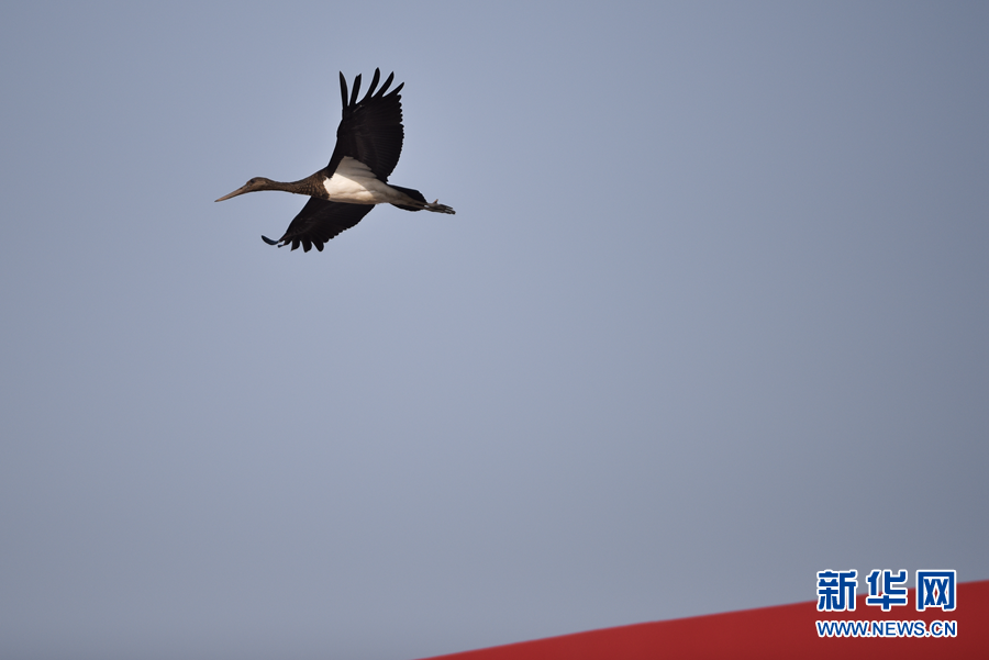 12月6日,一只黑鸛在西寧市北川河濕地公園上空飛翔。新華社記者 吳剛 攝