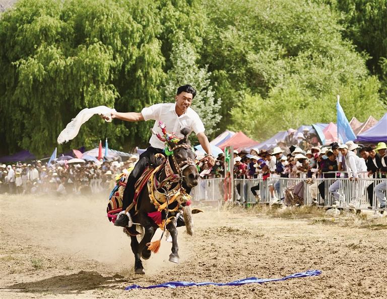 當日上午11時,茶巴朗村望果節(jié)賽馬正式開始,騎手們身著傳統(tǒng)服飾,戴著紅纓帽,身背彎弓,騎著打扮華麗的駿馬,進行了4000米速度賽馬、拾哈達、射箭、馬術等精彩比賽?,F場,觀眾揮舞手臂為選手們鼓勁吶喊。馳騁在賽場上,選手的吆喝聲伴著觀眾的吶喊聲在賽場上空匯聚。