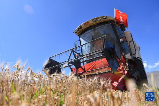 西藏日喀則市江孜縣熱索鄉(xiāng)努康村農(nóng)機合作社的村民集中對村里三千多畝耕地進行機械化收割(9月19日攝)。記者 晉美多吉 攝