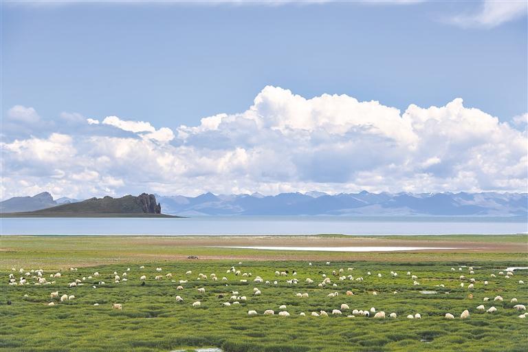 圖為在藏北高原,羊群在悠閑地吃草。記者 鹿麗娟 攝