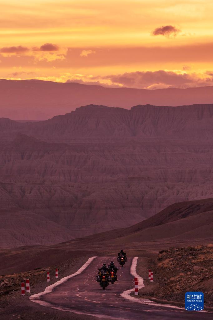 夕陽時分,三位騎士駕駛摩托車駛向札達土林(5月25日攝)。新華社記者 費茂華 攝