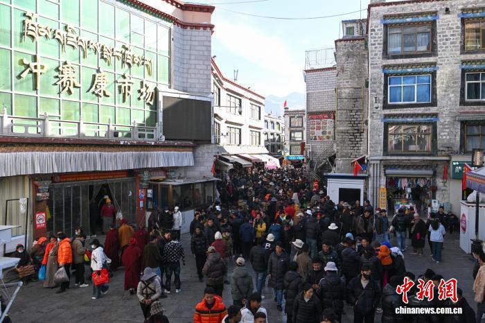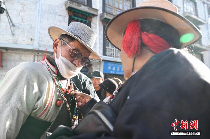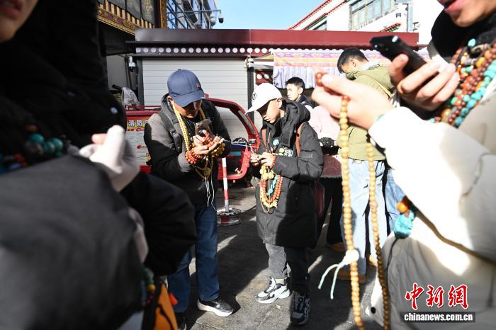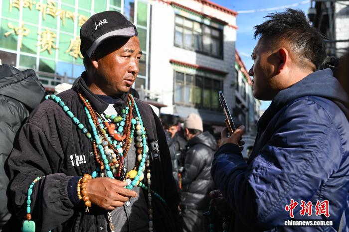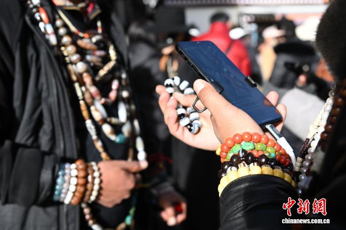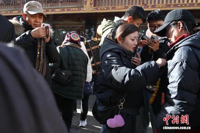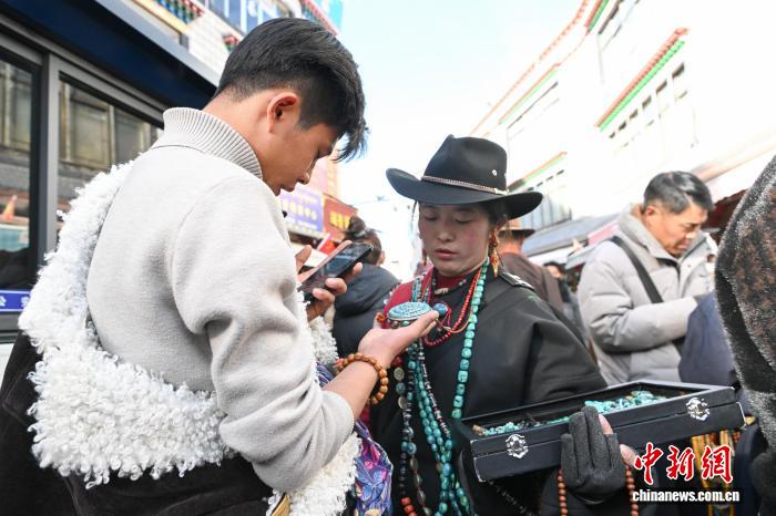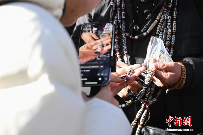1月9日,西藏拉薩市沖賽康露天集市,在陽光下熱鬧非凡。被民眾譽為“雪域高原義烏”的沖賽康露天集市,地處八廓古城核心區(qū)域,是拉薩最具歷史的古玩與小商品交易地。藏式古玩、特色手工藝品琳瑯滿目,這里延續(xù)著“袖筒交易”等傳統(tǒng)。近年來,商人搶抓電商機遇開啟直播帶貨,線上線下聯(lián)動,讓百年市集在傳統(tǒng)韻味與現(xiàn)代商貿(mào)的碰撞中煥發(fā)新生,盡顯雪域商貿(mào)獨特魅力。圖為商人在沖賽康露天集市直播帶貨。中新社記者 貢嘎來松 攝