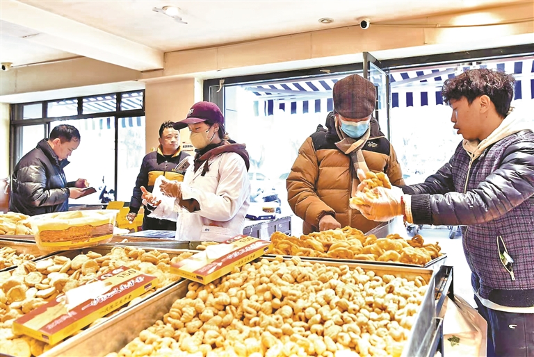 “卡塞”是一種油炸面食,是藏歷新年必備的年貨之一。橢圓形的“果子”、蝴蝶狀的“耳朵”……各色造型的“卡塞”寄托著人們對(duì)團(tuán)圓、富足的美好祈愿。店鋪里,剛出鍋的“卡塞”壘成小山,顧客絡(luò)繹不絕。