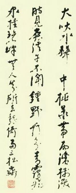 倪元璐書(shū)法流利秀雅,兼有澀勁樸茂的風(fēng)貌,風(fēng)骨凌厲,異態(tài)高古,格調(diào)曠達(dá)。用筆深得顏魯公厚實(shí)勁健之筆意,更為勁峭,結(jié)體趨于扁方,呈欹側(cè)之勢(shì),以險(xiǎn)寓正,風(fēng)格奇倔剛毅,自成一格。此行書(shū)豎幅《李白< ="" ="" ="" ="">》,絹本,縱103.7cm,橫60.3cm,現(xiàn)藏上海博物館。