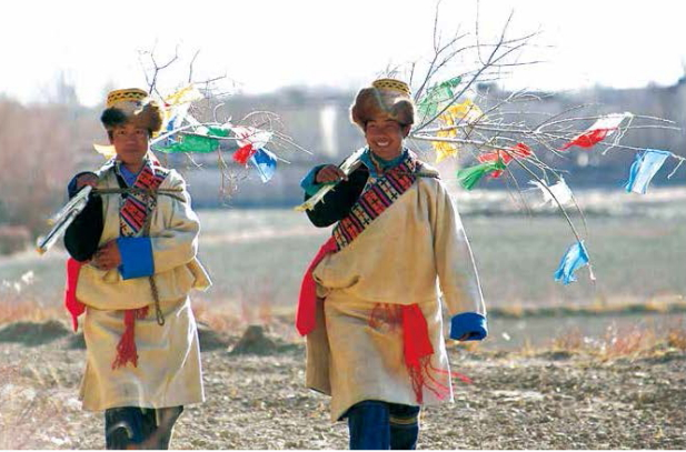 新年慶典活動,在正月初一天亮之前就開始了。早晨兩三點鐘,女主人要到附近的神泉和圣河里去背頭輪水。傳說大地之王辛赤曲杰除夕之夜要把雪山獅的奶灑在江河的源頭,誰最勤快,誰起得最早,誰能背到頭輪水,誰就有福氣、有財運。