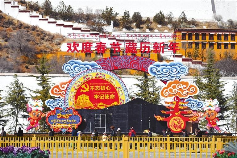 春節(jié)、藏歷新年臨近,我區(qū)各市(地)街頭巷尾處處洋溢著濃郁的節(jié)日氣氛。 圖為2月10日,布達(dá)拉宮廣場節(jié)日景觀花雕。 記者 李洲 攝