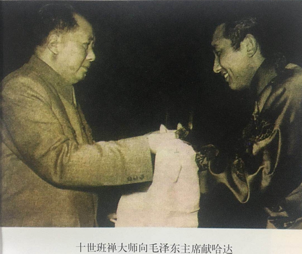 圖為十世班禪向毛澤東主席敬獻(xiàn)哈達(dá)。 圖片翻拍自《班禪額爾德尼評傳》