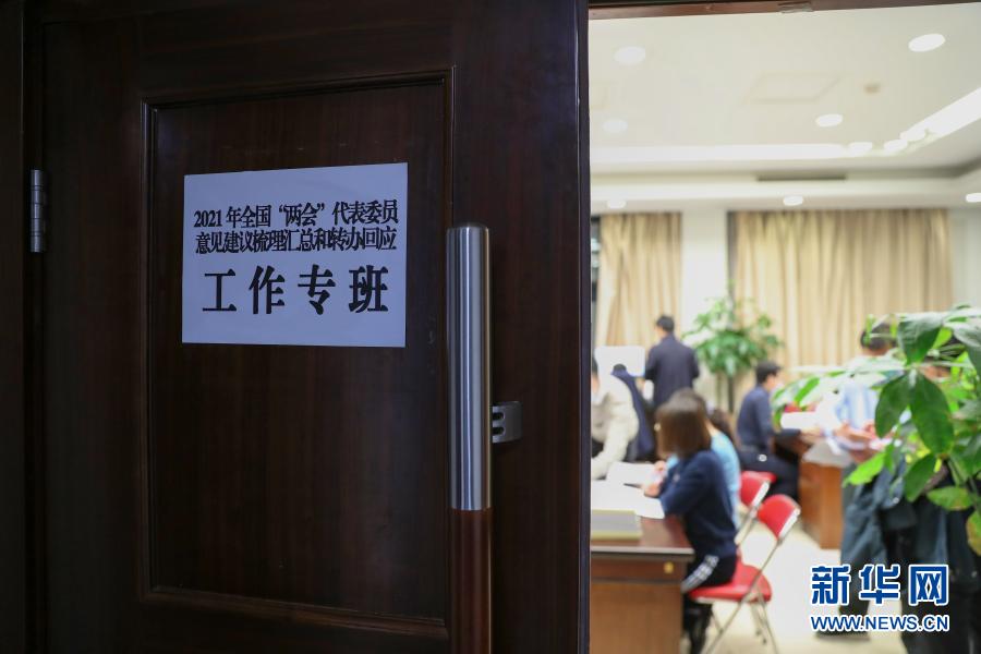 3月5日,2021年全國(guó)兩會(huì)代表委員意見(jiàn)建議梳理匯總和轉(zhuǎn)辦回應(yīng)工作專班的工作人員在忙碌。新華社記者 李木子 攝