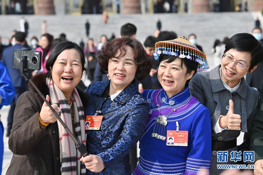3月7日,全國政協(xié)十三屆四次會議在北京人民大會堂舉行第二次全體會議。這是會議結束后,政協(xié)委員夏寧、區(qū)捷、韋震玲、楊靜華(從左至右)在人民大會堂外合影。新華社記者 李鑫 攝