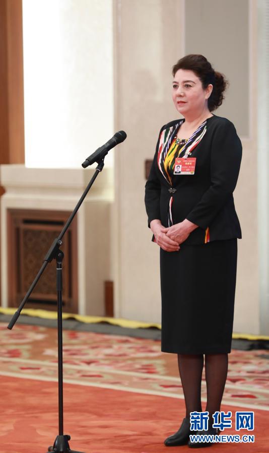 3月10日,全國(guó)政協(xié)十三屆四次會(huì)議第三場(chǎng)“委員通道”采訪活動(dòng)在北京人民大會(huì)堂新聞發(fā)布廳舉行。這是全國(guó)政協(xié)委員古麗帕麗·阿不都拉通過網(wǎng)絡(luò)視頻方式接受媒體采訪。新華社記者 王南 攝